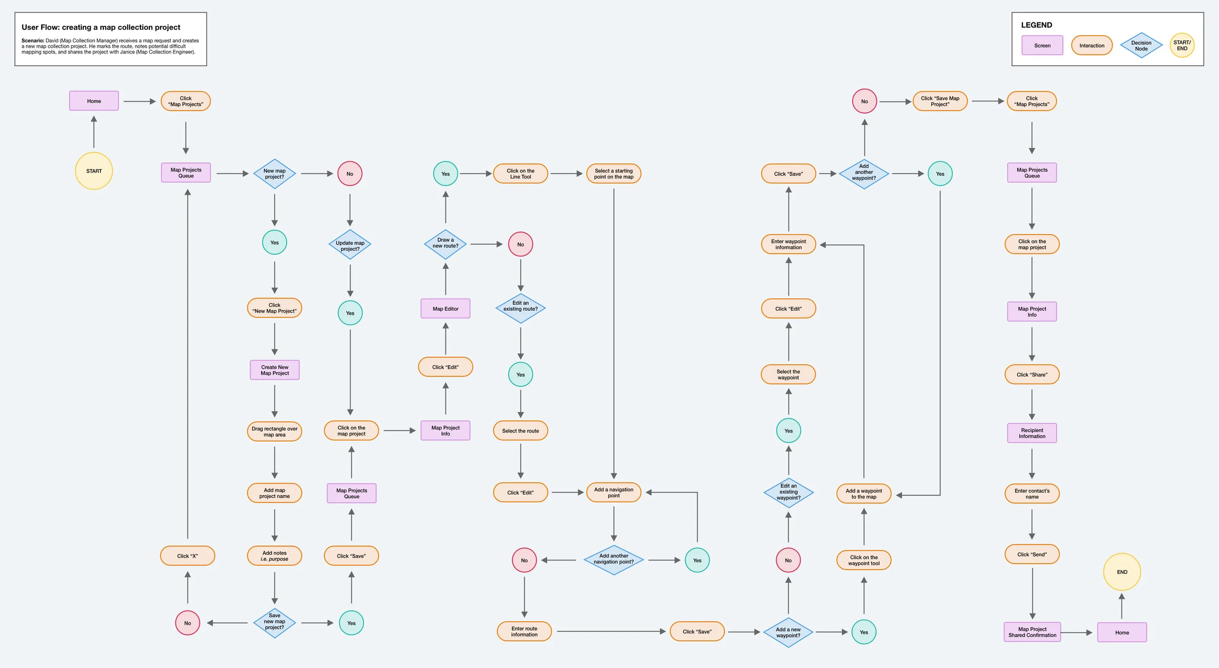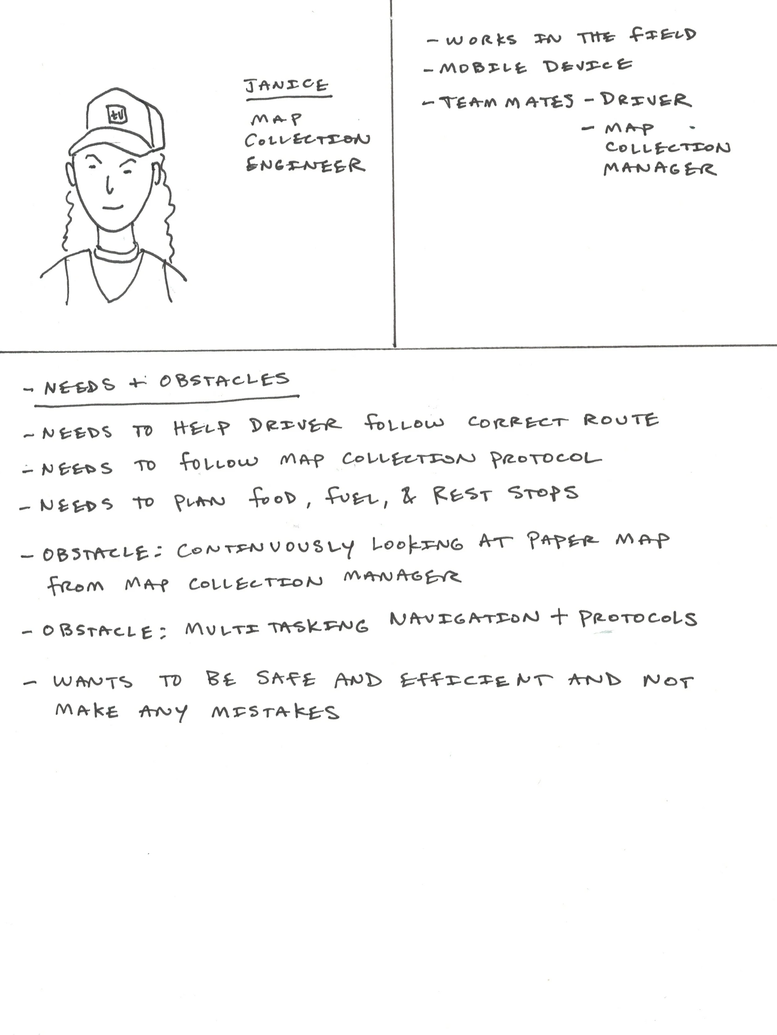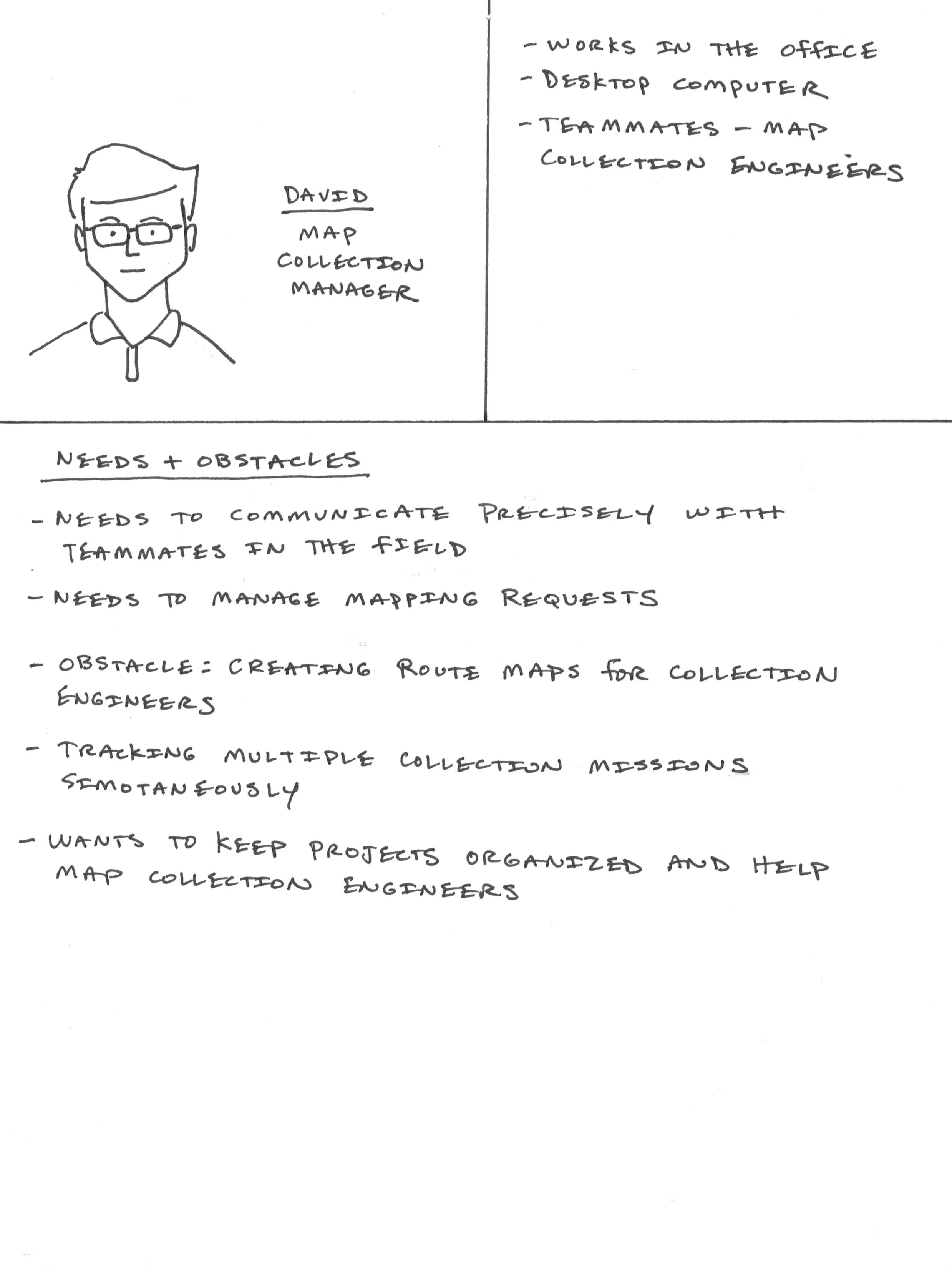 To keep the users front and center in my thinking I created user personas for David and Janice. I made the assumption that David works in an office on a desktop computer. He wants to keep projects organized and help the Map Collection Engineers reduce data collection errors. Janice works in the field. She wants to keep herself and her driver safe while accomplishing collection missions as efficiently as possible.