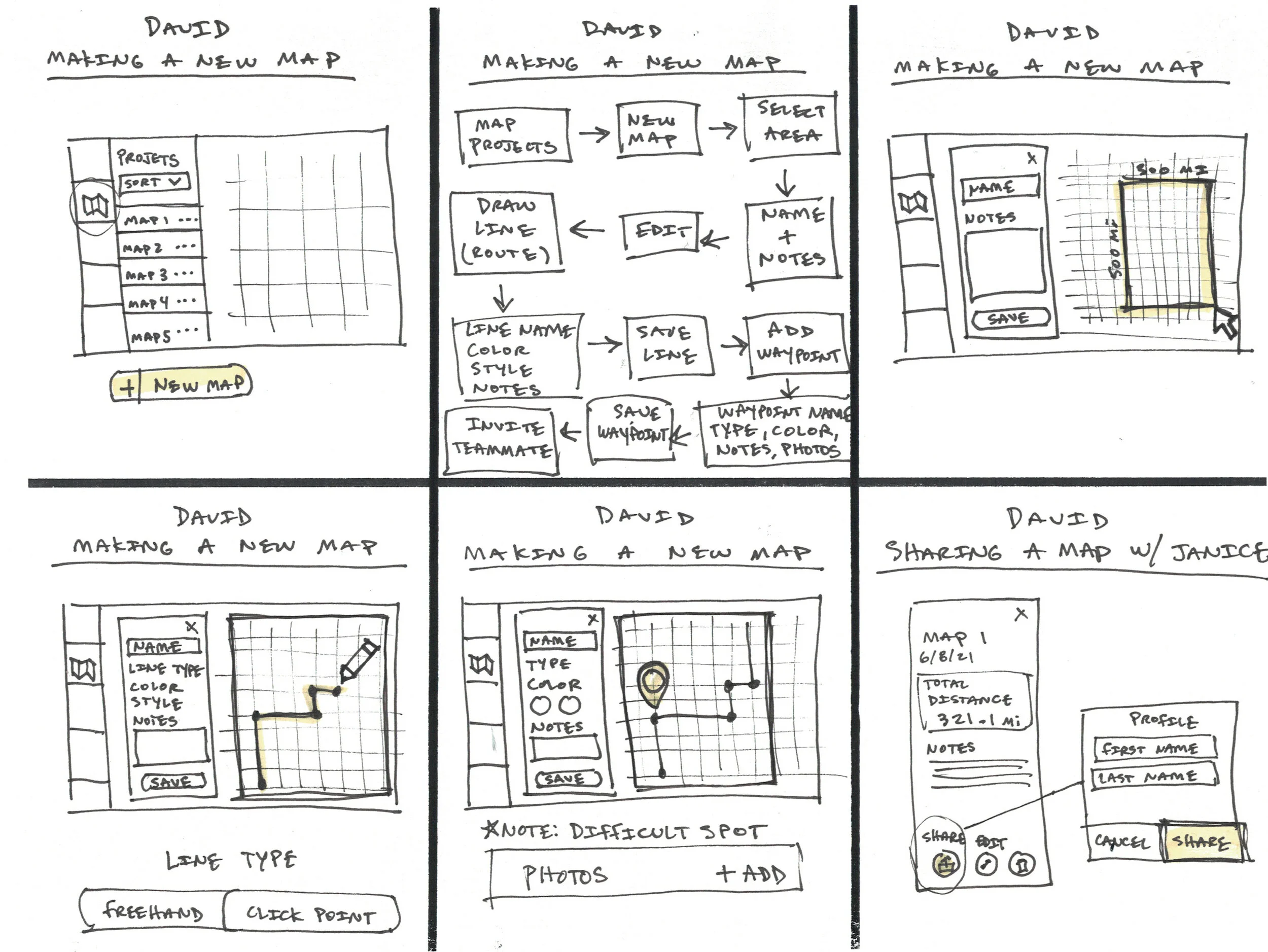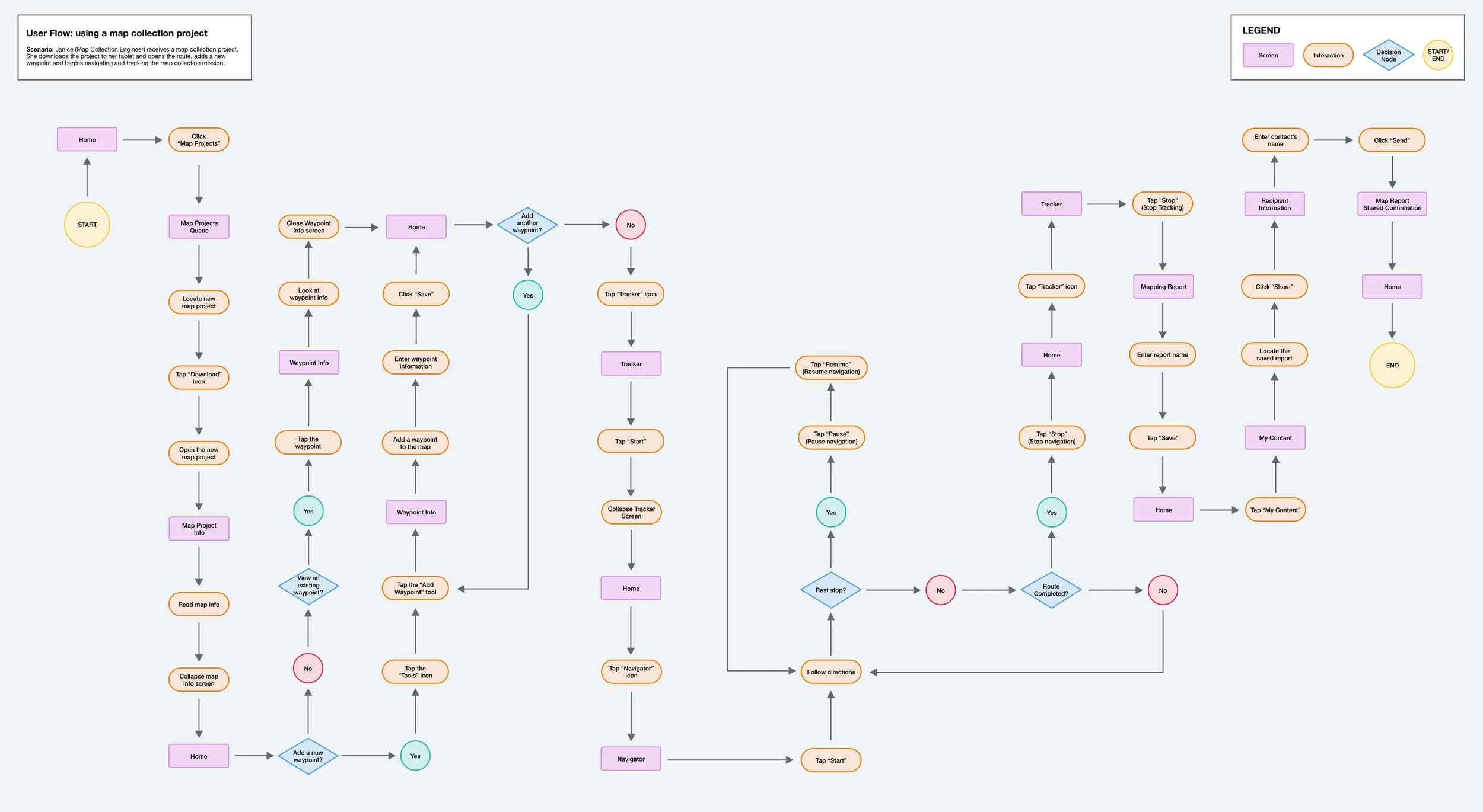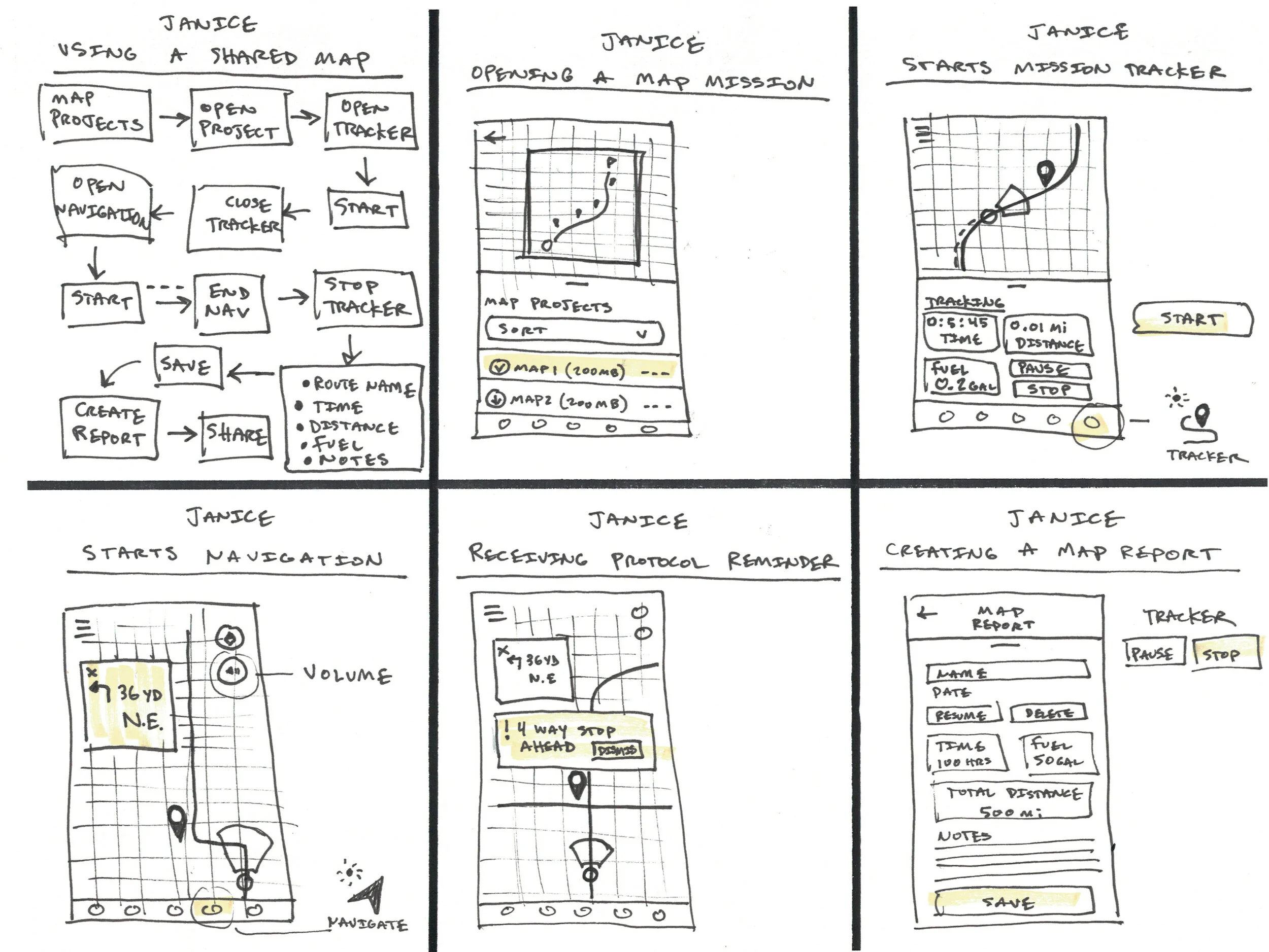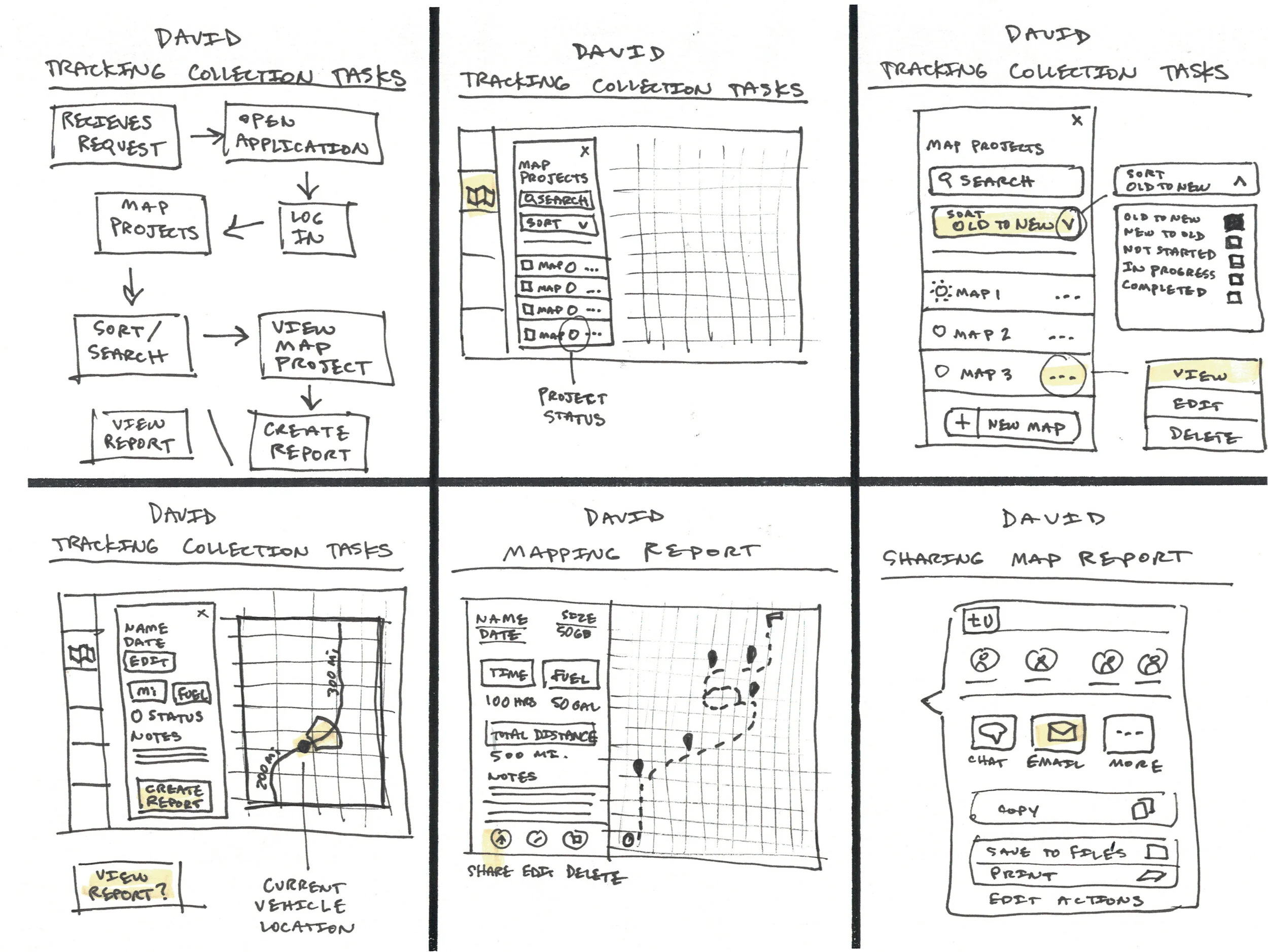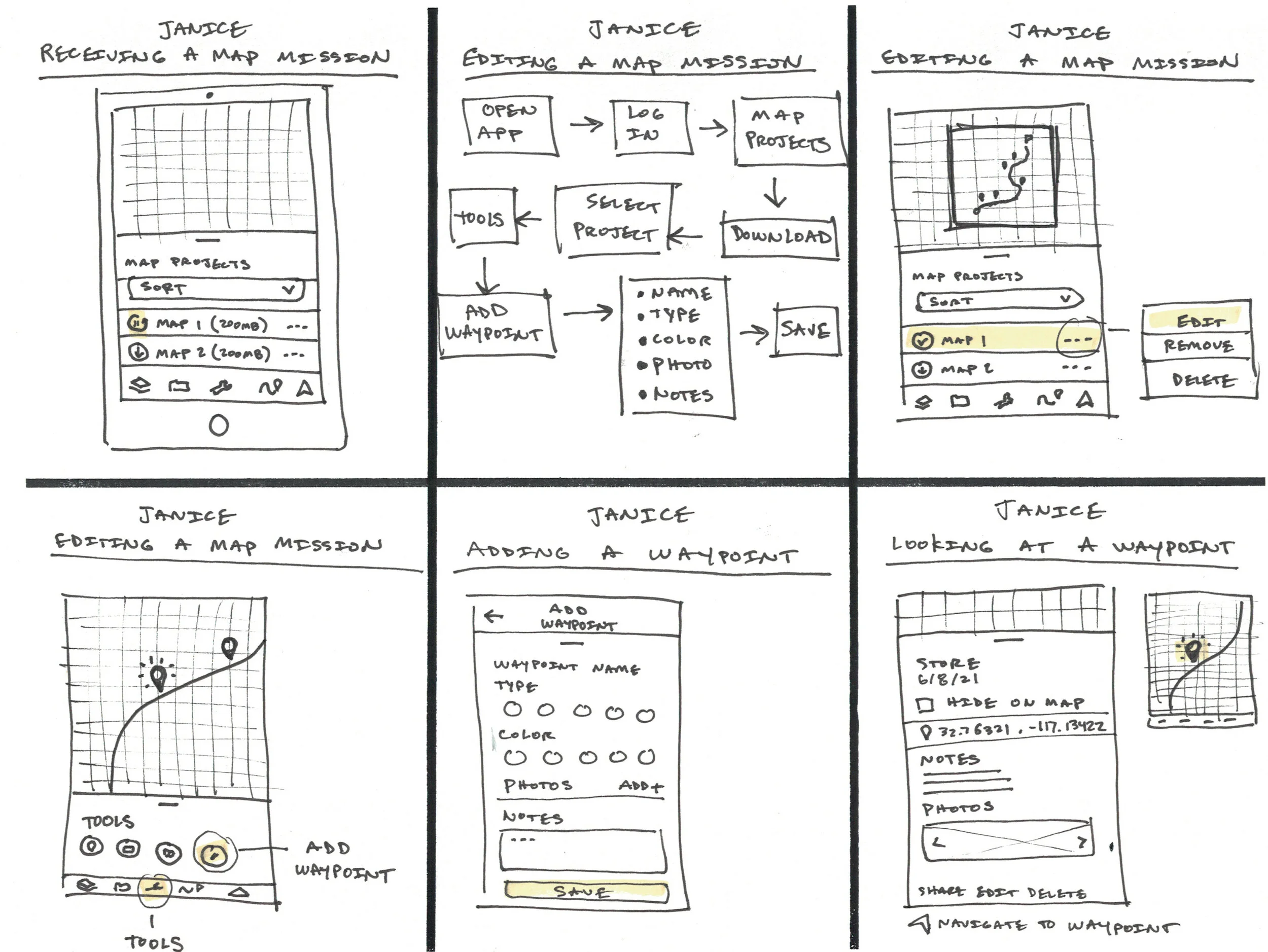 I generated low-fidelity sketches of the features and solutions including UI sketches, task flows, and diagrams. It became apparent that there would need to be 2 versions of the product that communicate with each other. One used by David to create maps in the office and manage collection tasks, and one for Janice to be used in the field for navigation and tracking.